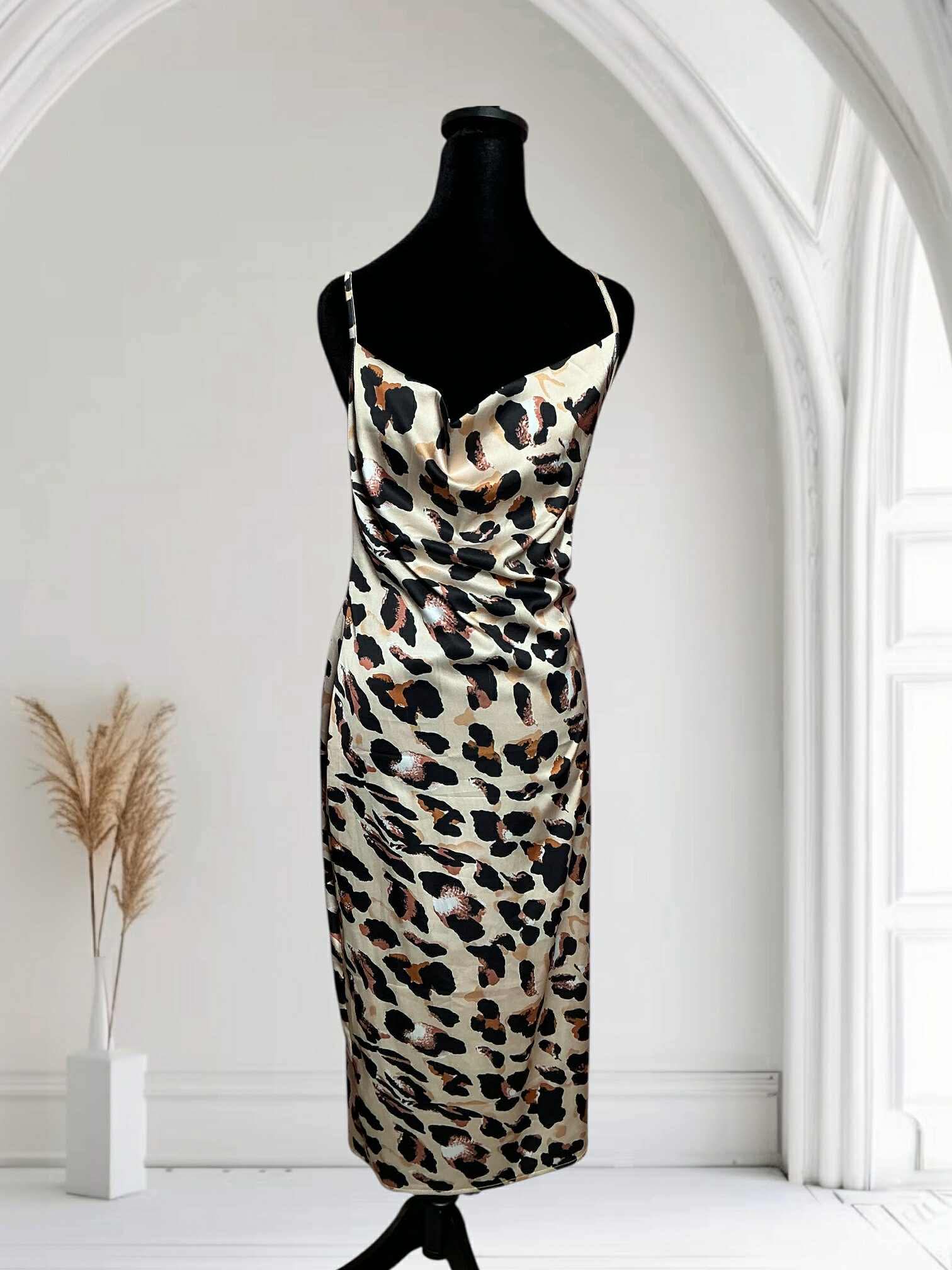 Fierce yet feminine, this satin slip dress features a bold leopard print with a soft sheen that drapes beautifully over your curves. Designed with dainty adjustable straps and a flattering cowl neckline, this midi is perfect for nights out, dinner dates, or layering with a chic jacket. A wild statement piece every glam girl needs in her wardrobe. Sz S